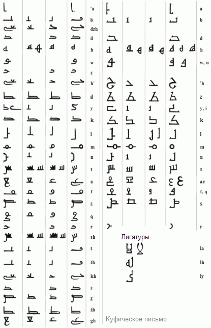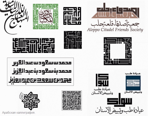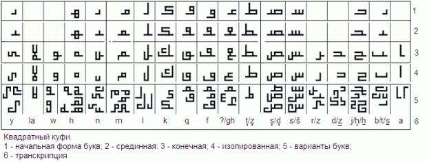 А ведь всё это арабские надписи, выполненные стилем квадратный куфи (взято с сайта “Арабское письмо”). А вот образцы арабских букв