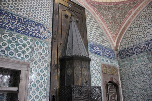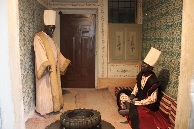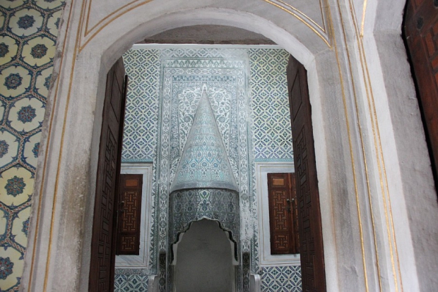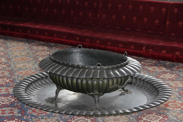 Металлический чугунок посередине комнаты представляет, как ни странно это звучит для русского человека, отопительный прибор - жаровню, куда клали раскалённые тлеющие угли. Учитывая довольно тёплый климат Турции, этого хватало, хотя в особо ответственных местах гарема всё-таки установлены стенные камины.