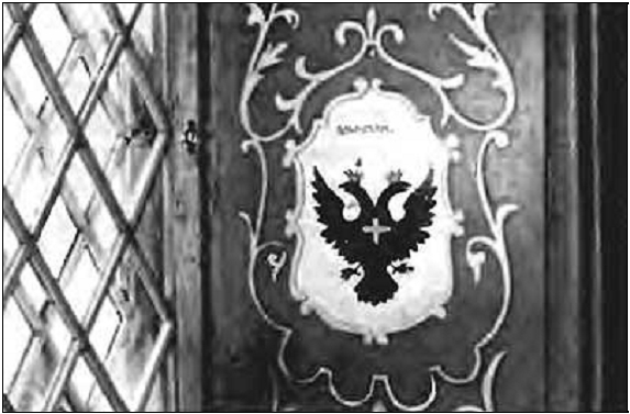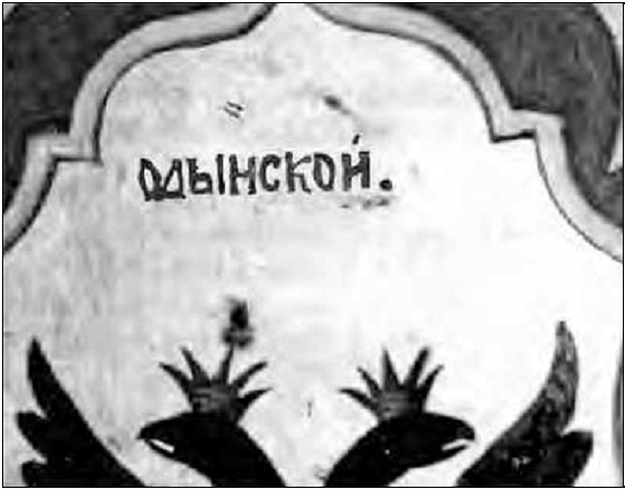Осматривая Теремной дворец Московского Кремля, мы обратили внимание на любопытный герб, помещенный, в числе прочих гербов, в росписи оконного проема, рис. 2.212. Слева от него — окно с цветными витражами. Герб расположен под гербом Смоленска. На рис. 2.212 мы видим двуглавого орла с КРАСНЫМ КРЕСТОМ на груди. Такой крест нам предлагают связывать исключительно с «западно-европейскими крестоносцами» якобы XI–XIV веков. Однако, как мы видим, эта символика присутствовала и на русских гербах. Весьма интересна надпись на гербе. Написано слово ГОДЫНСКОЙ. То есть Годынский. Но первая большая буква Г почему-то замазана белым, рис. 2.213. Получилось слово ОДЫНСКОЙ. Впрочем, даже надпись ГОДЫНСКОЙ странным образом сдвинута налево и написана поверх какой-то старой надписи, от которой практически никаких следов не осталось. Во всяком случае, мы не смогли ее прочесть.