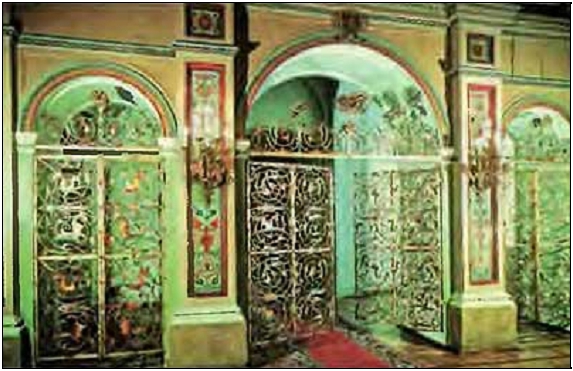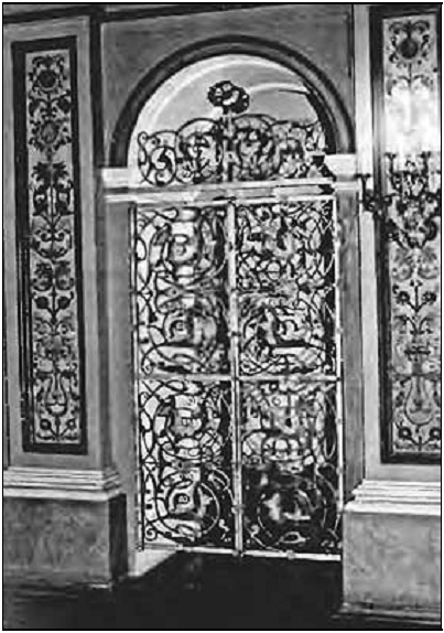 Роскошная «Золотая решетка» Теремного дворца Кремля, преграждавшая вход в палаты Теремного=Гаремного дворца. Как сообщается, «около решетки день и ночь дежурила стража» [96], комментарий к илл. 53. Все понятно. Особо тщательно охраняли женщин и детей. Взято из [549], илл. 32.