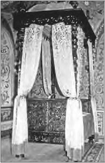 В ОДНОЙ ИЗ ЦЕНТРАЛЬНЫХ КОМНАТ СТОИТ БОЛЬШАЯ КРОВАТЬ, рис. 2.211. И тут экскурсовод неожиданно начал объяснять нам, что стоит она тут как бы «по ошибке». Оказывается, по мнению сегодняшних историков, предшествующие реставраторы XIX века «не поняли» сути Теремного дворца и зачем-то поставили сюда кровать. По словам экскурсовода, кровать сюда установил, или восстановил, археолог Рихтер. По мнению экскурсовода, он поступил неправильно, поскольку тут никакой царской опочивальни якобы никогда не было. Это было с нажимом повторено нам несколько раз. Возникло впечатление, что следы гаремного предназначения данной части дворца сохранились до сих пор, однако после неоднократных романовских реформ русской истории говорить о гареме в Московском Кремле фактически запретили. В результате о гареме в Кремле забыли. Но сегодня, время от времени, наталкиваясь на те или иные «следы гарема», в том числе и в старых описаниях, историки ощущают диссонанс между старыми фактами и тем, что написано в современных учебниках. И начинают объяснять посетителям «ошибки реставраторов XIX века».