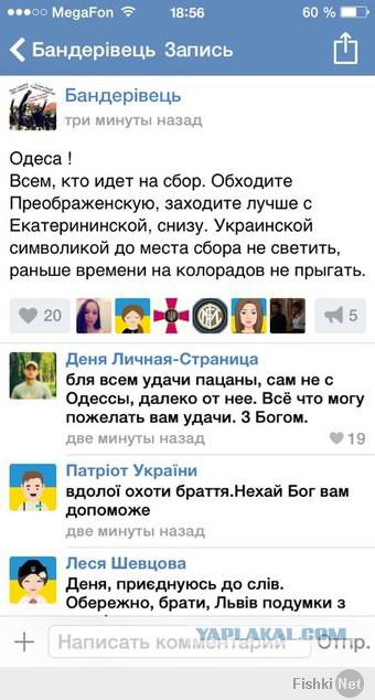 P.S. И я прошу вас, друзья, не называйте погибших в Одессе ребят "одесской сотней". Пожалуйста, не надо. Они не заслужили, чтобы к ним приклеилось это позорное майдановское погоняло. "Небесная сотня" - это фальшивый, трижды купленный и десятеро проданный миф, как бандера и шухевич. Не позорьте отважных 46 ребят-одесситов даже намёком на подонков майдана. Давайте 46 ребят из Одессы называть "героями 2 мая".