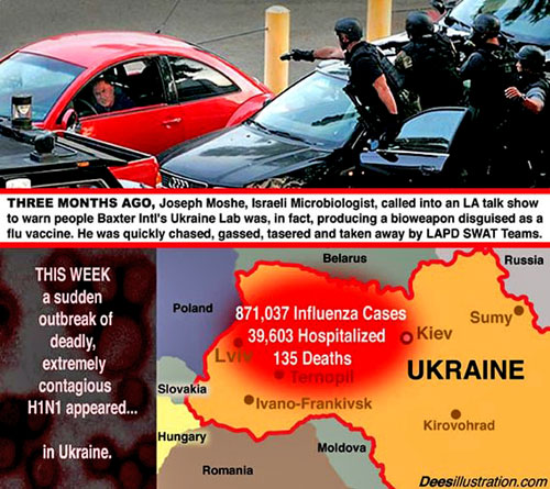 Между тем, тогда честный израильский микробиолог Джозеф Моше, во время прямого телеэфира на американском радио заявил, что «Baxter International» на Украине на самом деле производила не вакцины «от свиного гриппа», а настоящее биологического оружие.