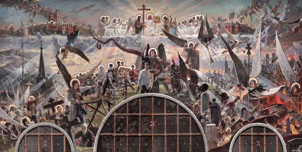 Замечательно, что вы вспомлили об Евгении Родионове, принявшего смерть за нас всех, за нашу веру. Позволю, если вы не обидитесь чуть чуть добавить об увековечивании памяти новомученика Евгения: в храме в Якутии есть замечательная картина -роспись стены работы П.Рыженко под названием "Страшный суд", на которой по правой стороне от Господа и тоже есть и воин Евгений. Я через час, если никто до этого не поместит, вставлю картину и отдельно фрагмент с Родионовым.