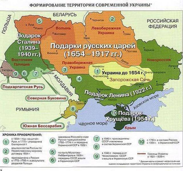 Маленькая историческая справка. Как известно, под властью Богдана Хмельницкого находилась одна шестая часть от территории современной Украины. Откуда же взялось остальное? Очень просто. В конце 17-го века во время Азовских походов Петр Первый отвоевал у турок Таганрог. Затем - еще 100 лет русско-турецких войн (в которых посильное участие принимала и Украина). Посылаемые Екатериной Второй Потемкины, Румянцевы, Суворовы отвоевали юг Украины (там теперь находятся Одесса, Николаев, Херсон, Симферополь и т.д., и т.д.). В конце 18-го века Суворов штурмом взял Измаил. Украинские земли у Польши отобрала также Россия (свою посильную роль в этом играла и Украина). Последний эпизод в этой истории - 1939 год. Согласно пакту Молотова -- Риббентропа к СССР отошли Западная Украина и Западная Белоруссия. А еще в 1939 году Сталин забрал у Румынии Буковину, а в 1945 году у Венгрии и Словакии - Закарпатье. А еще в 1954 году подручный Сталина Хрущев отписал Украине завоеванный Екатериной Великой Крым.