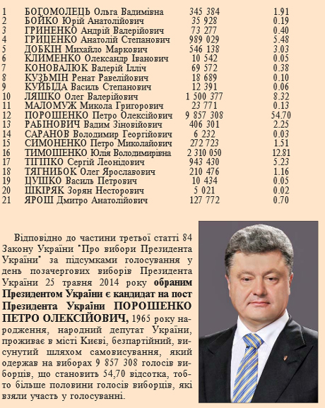 Избранным президентом стал народный депутат Петр Порошенко, который получил 54,7% голосов избирателей.