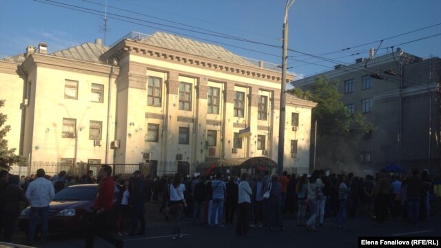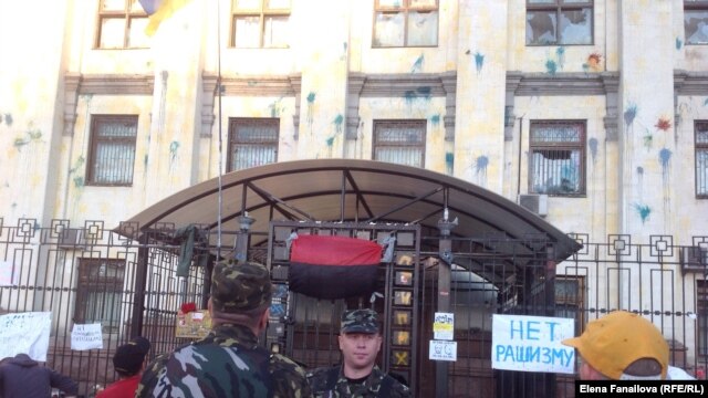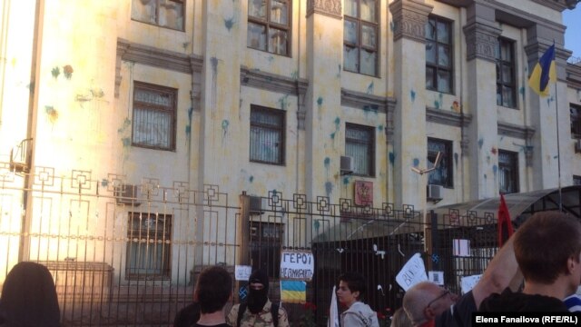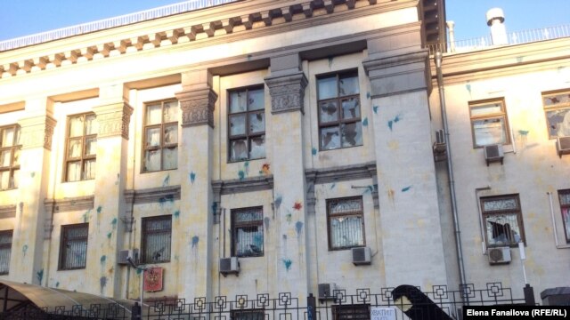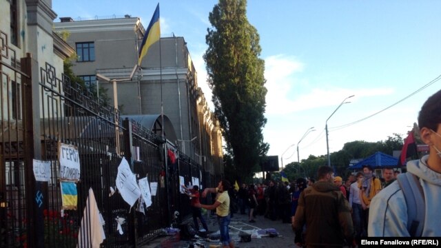 Пикет у российского посольства в Киеве в связи с проникновением российских танков на территорию Украины и сбитым в Луганске сепаратистами самолетом ИЛ-76 перерос в беспорядки. Пострадал фасад посольства и автомобили сотрудников.Мирный день на фестивале Шопена в замке Радомысль закончился поездкой на Воздухофлотский проспект, к дому 27, где к восьми вечера протестанты уже часа полтора били машины российского посольства. С проезжей части здание и манифестанты выглядели так.