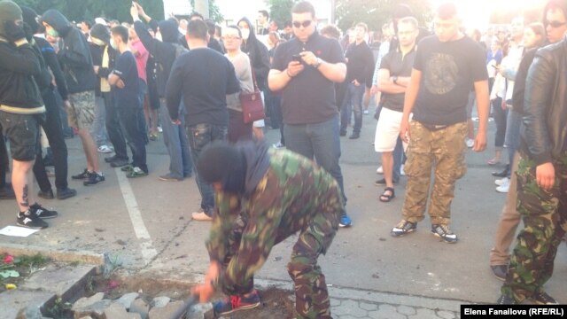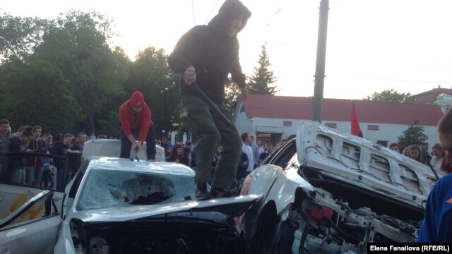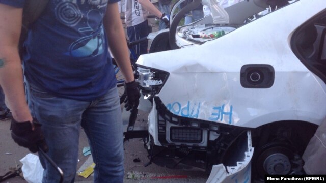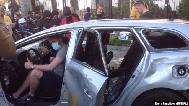 Собравшихся около 300, ядро их составляют молодые люди в масках, именно они разбивают машины российского дипкорпуса.