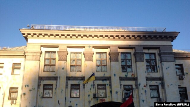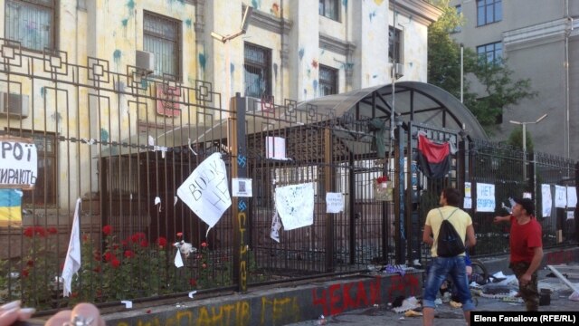 Фасад за время работы протестующих по закидыванию его яйцами, краской и камнями приобрел следующий вид.