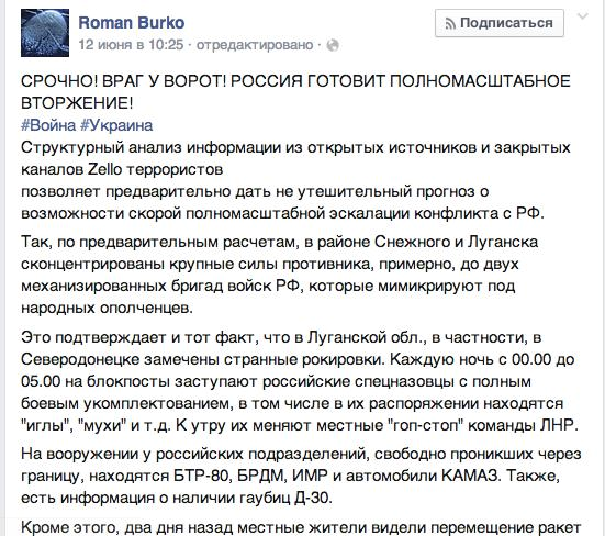 13 июня для «разжигания», так сказать, некто Роман Бурко, именующий себя «вольным журналистом», забрасывает на Фейсбук утку о колонне танков из РФ и "перемещениях ракет".