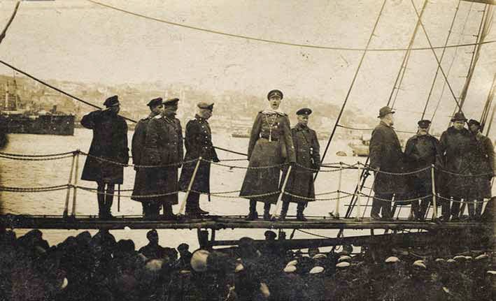 Главнокомандующий генерал барон П. Н. Врангель обращается к войкам после эвакуации из Крыма. Справа от П. Н. Врангеля — генерал В.К. Витковский, слева — генеоал П.А. Кусонский, за ним —генерал А. П. Кутепов. Транспорт «Ак-Дениз». Константинополь. Конец ноября 1920 года. |