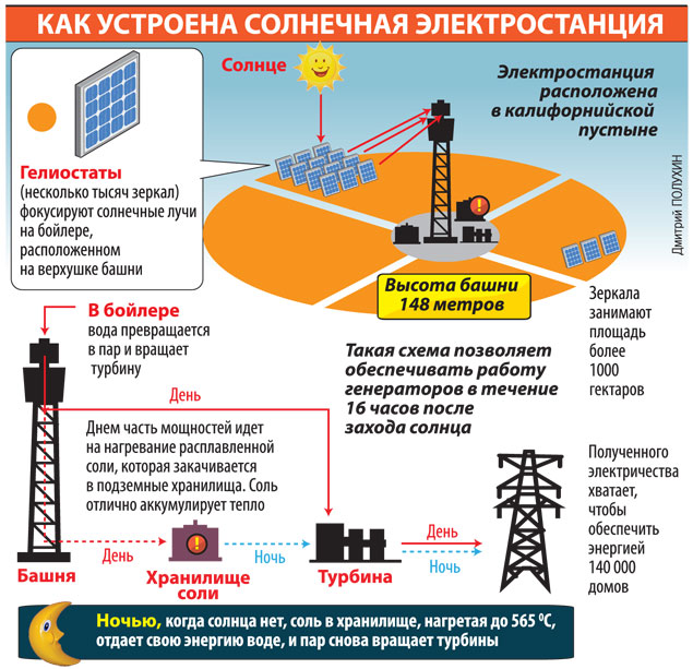 Операторы следят за тем, чтобы зеркала все время были повернуты к солнцу. Солнечные лучи фокусируются на вершины трех гигантских башен (каждая высотой около 150 метров), где установлены бойлеры. Полученный пар раскручивает турбины. А теперь внимание: днем часть мощности идет на нагревание резервуаров с расплавленной солью, которая считается лучшим аккумулятором тепла. Ночью, когда солнца нет, турбины вращаются за счет того, что расплавленная соль отдает тепло. Таким образом, эти хранилища могут обеспечить выработку электроэнергии в течение еще 15 часов после захода солнца. А значит, доить светило научились круглосуточно.