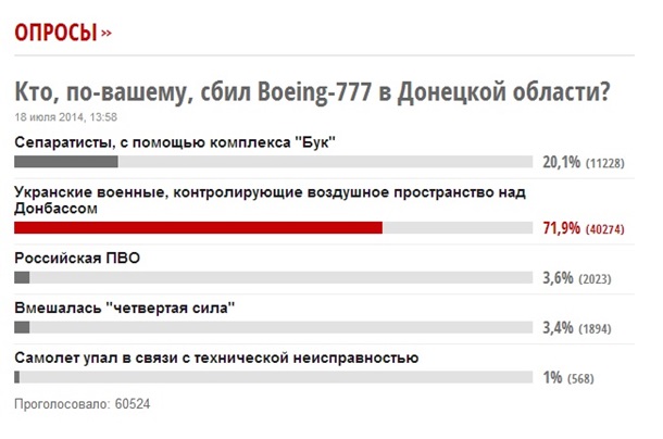Что дико расстроило хозяев этого УкроСМИ, так это то, что столь впечатляющее единодушие голосующие проявили в пользу единственной реальной версии произошедшего - а именно, что "Боинг" был сбит военными киевской хунты.