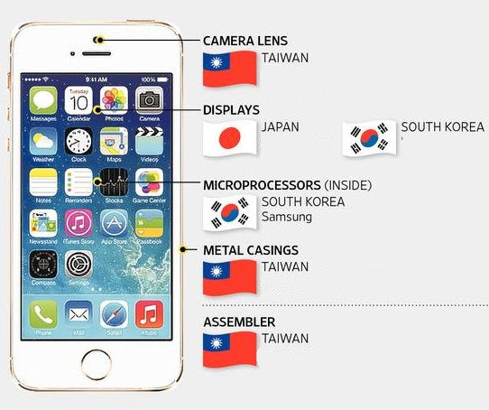 Дисплеи для (самый дорогой элемент устройства) производят в основном, в Японии и Южной Корее. Металлический корпус телефона (второй по стоимости элемент) – в Тайване. Линзы для видео камер - тоже в Тайване. Samsung поставляет чипы памяти и микропроцессоры. Сами смартфоны iPhone собирают в основном на материковом Китае. Об уровне зарплаты и условиях труда там можно и не рассказывать. Они ужасают.