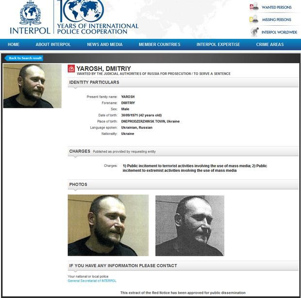 Анкета Яроша размещена в базе разыскиваемых лиц на официальном сайте Интерпола.