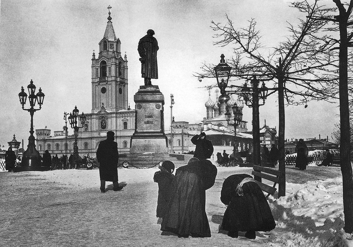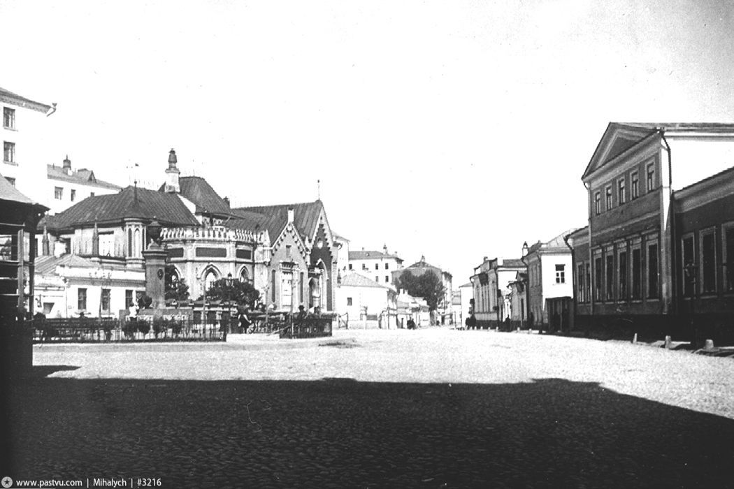 Так выглядела нынешняя Пушкинская площадь: памятник Пушкину еще стоял на Тверском бульваре, а на его нынешнем месте возвышалась колокольня крупного Страстного монастыря.