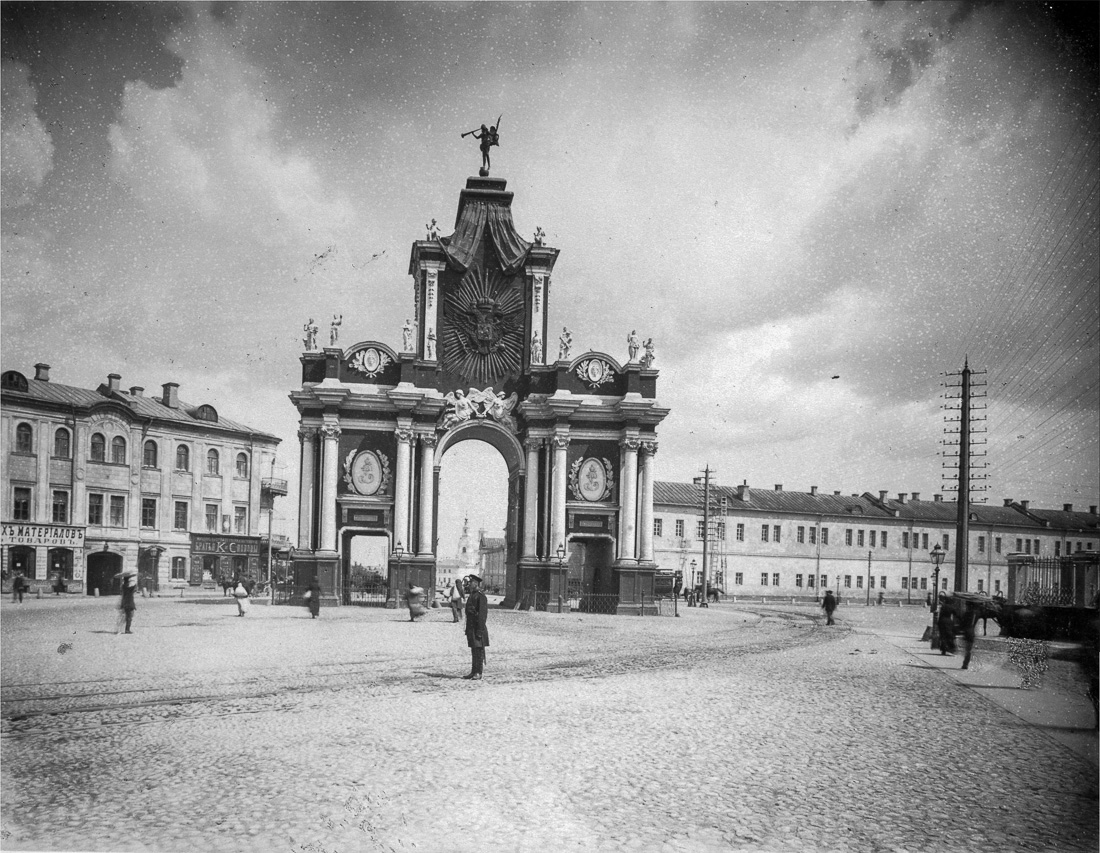 От некогда украшавших площадь ворот осталось на карте лишь одно название, да и стоявший за ними храм снесли. Ворота были изначально возведены при Петре I в 1709 г. в честь победы в Полтавской битве, к середине 18 века были перестроены в камне. Снесены в 1927 г. при расширении Садового кольца.