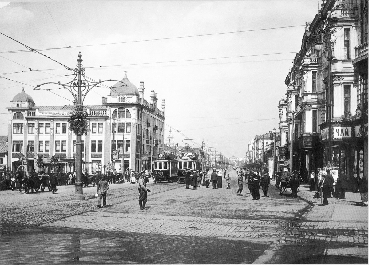 Так Тверская выглядела еще в 1920-х в районе Камергерского переулка. Большая часть застройки была снесена по плану реконструкции Москвы 1935 г., за редкими исключениями, как например, подворье Саввино-Сторожевского монастыря (на фото справа), которое решили сохранить, но по рельсам передвинули во дворы, где его и сейчас можно видеть.