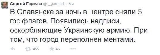 Наши посты укреплены. На рации стабильно весело и бодро обсуждаются одни и те же проблемы нашего города. Мы гордимся тем, что Славянск все больше и больше становится популярным! Гордость! Название нашего маленького неприметного городка звучит с уст дикторов российских каналов! Славянск! Мы смеемся. Смеемся и передаем информацию об увиденной технике, приближающейся к городу... Её передают жители близлежащих поселков — мужчины, женщины, дети и старики. Бабушки описывают в канале цвет увиденной «подозрительной» машины, марку, количество вышедших из неё мужчин «в темном». Мы не знали, что нас ждет...