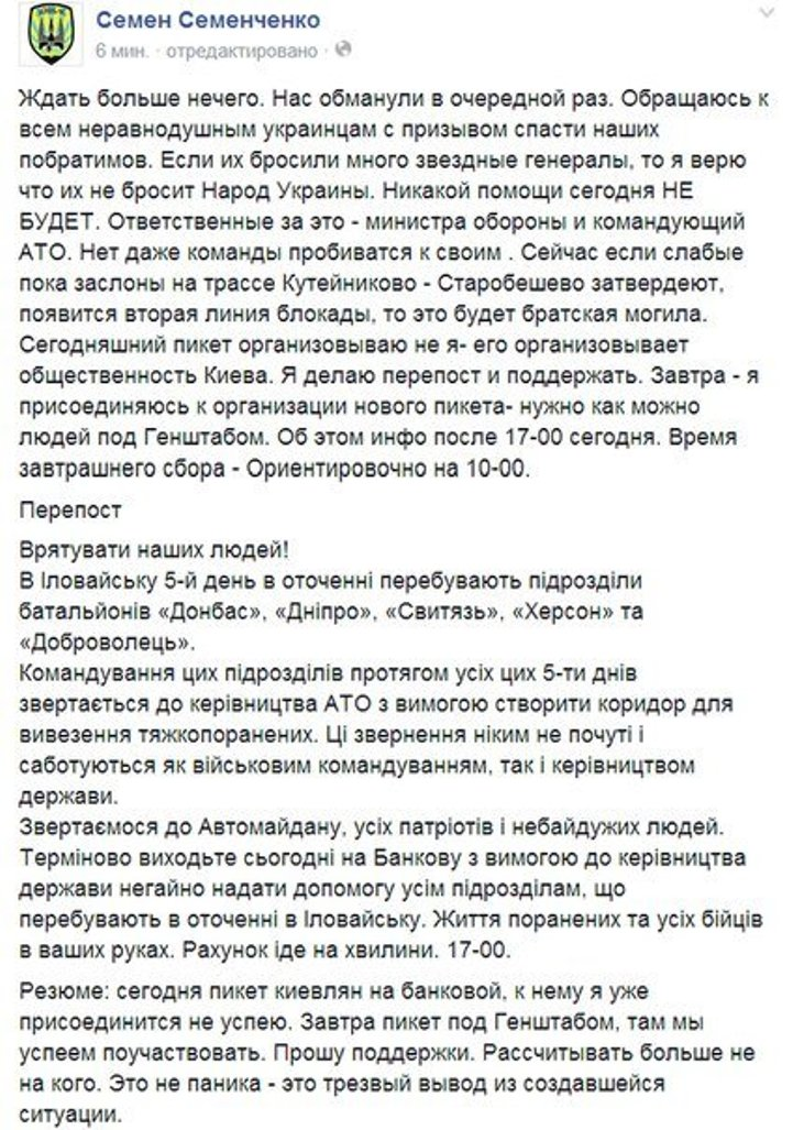 С поля боя бегут целыми частями. Так 400 военнослужащих 5-го батальона территориальной обороны снялись с Амбросиевки и без приказа выехали домой в Ивано-Франковск. Ополчение сообщает о 82 бойцах сил АТО взятых в плен. Силы АТО, голодные, «ободранные» и без боеприпасов, находящиеся в окружении просят помощи, но Киев их не слышит. Армия Новороссии уверенно ликвидирует украинских командиров , 27 августа 2014 года в боях за Саур-Могилу погиб очередной — Тимур Юлдашев.