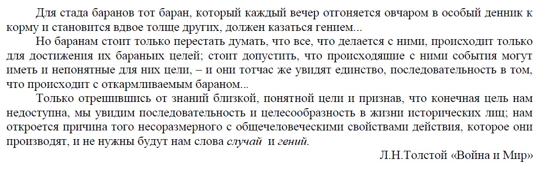 Чем дальше бежали французы,…тем сильнее разгорались страсти русских начальников, обвинявших друг друга и в особенности Кутузова. Всеми этими людьми, именно потому, что они не могли понимать его, было признано, что со стариком говорить нечего; что он никогда не поймет всего глубокомыслия их планов; что он будет отвечать свои фразы (им казалось, что это только фразы) о золотом мосте, о том, что за границу нельзя прийти с толпой бродяг, и т. п. Это всё они уже слышали от него. И все, что он говорил: например, то, что надо подождать провиант, что люди без сапог, все это было так просто, а все, что они предлагали, было так сложно и умно, что очевидно было для них, что он был глуп и стар, а они были не властные, гениальные полководцы.
