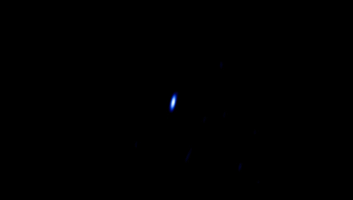На изображении показан радиообраз космического зонда Voyager 1. Он был получен антенной решёткой со сверхдлинными базами VLBA (Very Long Baseline Array), которая представляет собой набор из 10 радиотелескопов, разбросанных по территории от Гавайских до Виргинских островов. Она захватила слабый радиосигнал далёкого зонда. По сути, эта всего лишь бледная точка – на настоящий момент самый удалённый от Земли объект, сотворённый человеком.
