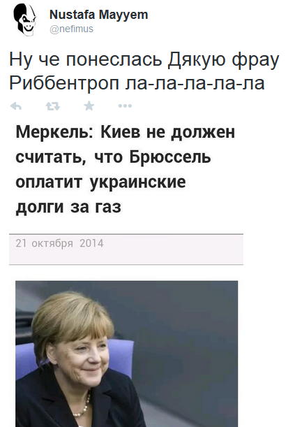 Известный украинский журналист Мустафа Найем был неприятно удивлен позицией Евросоюза, выраженной словами фрау канцлерин Германии Ангелой Меркель. Та без обиняков заявила о том, что напрасно в Киеве считают, что Евросоюз оплатит украинские долги за газ. Так был удивлен, что даже в твиттер поместил злобное сообщение: