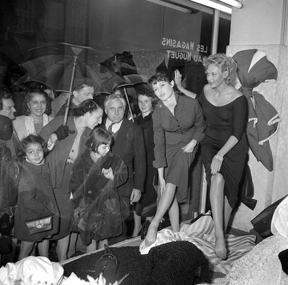 Брижит Бардо и Тильда Тамар демонстрируют чулки в витрине магазина в Париже.