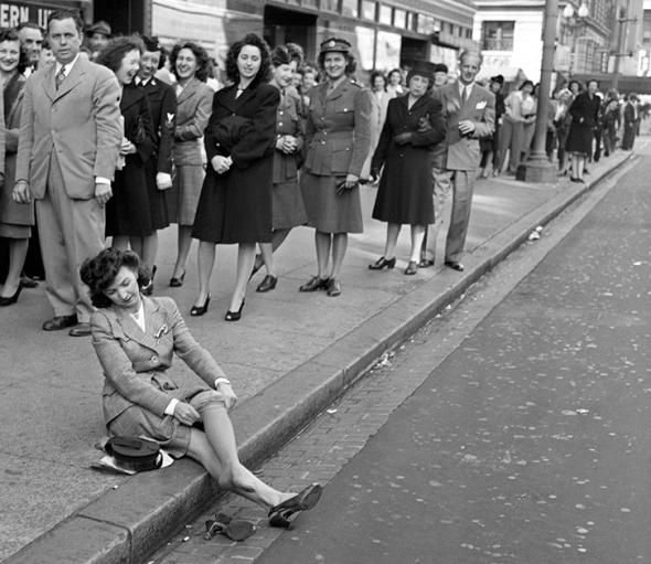 Во времена военного дефицита находчивые женщины нашли простую альтернативу пропавшим из продажи чулкам: они рисовали "стрелки" прямо на голых ногах, создавая иллюзию чулок.