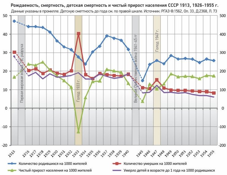 1933 год- смертность в 2 раза превысила рождаемость, 1934 -1940года- рождаемость на уровне примерно на уровне 1929 года и смертность начинает падать ,прирост населения становится из отрицательного положительным, но всё равно ниже 1927 года , где то на уровне 1929 года т.е. начала коллективизции . Вопрос надо ставить так, каким бы было народонаселение СССР, если бы рождаемость и смертность были бы хотя бы на уровне 1929 года. 1542000000 население 1929 года .Рождаемость 0.04*154200000=6.168000 в год. Смертность. 0.02*154200000=3084000 в год. Прирост 3084000 чел или за 8 лет 178720000 на 1937 год . Если сравнивать http://demoscope.ru/weekly/knigi/polka/gold_fund08.html