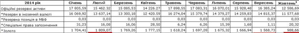 Сайт НБУ позволяет отследить колебания золотого запаса (динамика курса также известна). После февраля запас то сокращался, то увеличивался (частично это объясняется колебанием курса золота). Однако если еще в сентябре запас оценивался в $1,568 млрд, то уже в октябре – всего $0,988 млрд. И колебания курса не столь велики, чтобы объяснить ими такое падение.