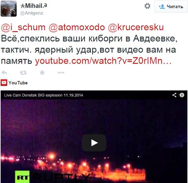 Однако вату в этом не убедить и уже с утра социальные сети штурмуют сообщения о том, что по киборгам в Авдеевке был нанесен тактический ядерный удар! Радость и счастье колорадского стана поражает, особенно если учитывать тот факт, что даже если и был бы нанесен подобный удар, то почему-то никто не задумался о том, что в Авдеевке есть мирные жители и о последствиях подобного удара.