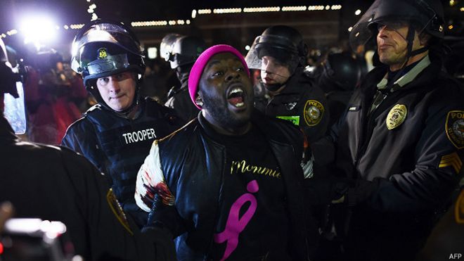 Десятки тысяч американцев протестуют во многих городах США против решения большого жюри присяжных оправдать полицейского, застрелившего 18-летнего чернокожего подростка Майкла Брауна.