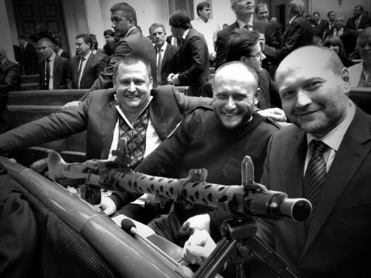 На фото три «народных избранника» неонацисты Борис Филатов, Дмитрий Ярош и Борислав Береза, с улыбками на лицах восседают в депутатских креслах с MG-34.