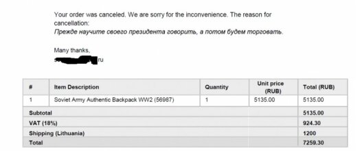 По его словам, вместе с автоматической информацией об отмене заказа пришел и грубый комментарий на русском языке, объясняющий, почему заказ не будет выполнен: «Прежде научите своего президента говорить, а потом будем торговать»