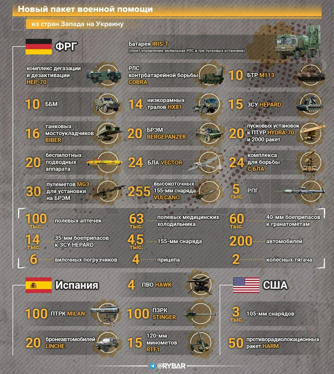 Новый пакет поставок вооружения из Германии будет включать бронеавтомобили, зенитные самоходные установки, зенитные ракетные комплексы, пусковые установки для ведения огня управляемыми и неуправляемыми ракетами, противотанковые ракетные комплексы и ручные противотанковые гранатометы, беспилотные летательные и проводные аппараты и пр.