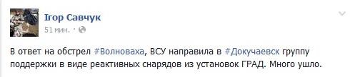 Кроме того, боец сообщил, что "в ответ на обстрел Волновахи ВСУ направила в Докучаевск группу поддержки в виде реактивных снарядов из установок ГРАД. Много ушло".