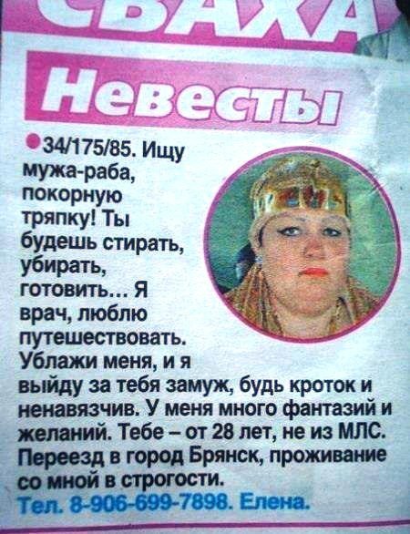 "Цель - замужество, подробности в переписке. Москва, «Брачная Газета», пр. кв. №578".