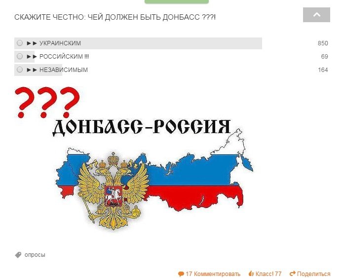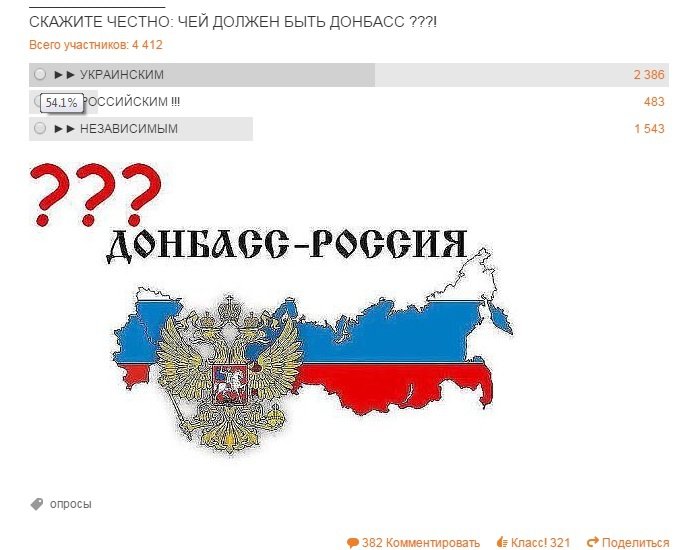 Единственный раз делался более-менее широкий опрос среди русских Донбасса - десятки вот этих анкет в донбасских сообществах "одноклассников", и тот дал такие результаты , что пропагандонский цех зарекся делать какие-либо реальные опросы.