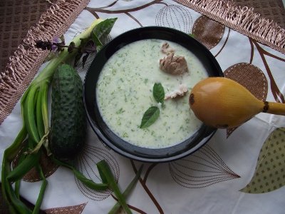 Несладкий йогурт развожу с холодной водой, туда добавляю укроп, огурец, можно по желанию также зеленый лук, редиску, яйцо. Получается великолепное охлаждающее блюдо.