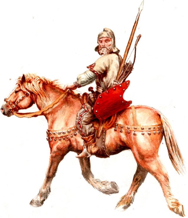 Как показал Ю.Д.Петухов,скифы вели "казачий" образ жизни.Конь был верным другом и на охоте,и в бою,а также олицетворял бога Хорса(слово сохранилось в английском языке,и означает просто "лошадь"). А здесь мужчина средних лет на коне и с копьем,одетый в рубаху в "горошек" и просторные шаровары с...лампасами.Как бы ни было забавно,но это - факт.Казаки могут гордиться.