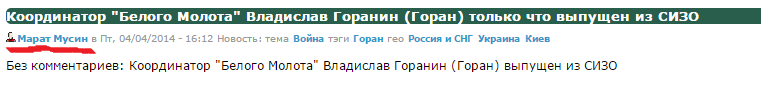 Отвлечемся. Все время пока была эта котовасия на майдане, с Гораном общались волонтеры Аннаньюс..ну того самого ньюс, в котором волонтерил Стрелков и в котором волонтерит Мусин ( вспоминаем сразу недавний визг анны ньюс что их выкидывают с Донбасса, ранишний визг Мусина что его хотели убить на Донбассе и последний писк что волонтера анны хотят отдать укропам..вот просто запомните сами сделаете вывод, может не спроста, ибо кот пишет только кусками, вот щас этот кусок )