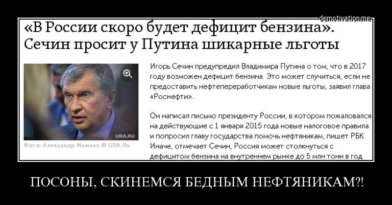 Президент Сечину на этот раз отказал. Что же это, неужели последние времена наступают? Представьте, в Фонде национального благосостояния (ФНБ) нет денег на поддержку блестящих прожектов главы «Роснефти». Для чего же этот фонд в таком случае еще нужен? Впрочем, поспешных выводов лучше не делать. Отказ официально не подтвержден, в Кремле ничего не комментируют, а на письме Сечина, попавшем в прессу, в качестве даты решения вопроса указан октябрь. Сечин просил софинансирования для модернизации Ангарского нефтехимического комплекса, ссылаясь на то, что доходность нефтеперерабатывающих предприятий вдруг драматически упала в первом квартале 2015 года. А кроме того, льготных тарифов на перевозку любых грузов «Роснефти» железнодорожным транспортом и помощи государства в освоении двух газовых месторождений. В конце июля «Роснефть» направила заявку на получение финансирования из ФНБ на сумму 2,4 трлн рублей, в дополнение к уже имеющейся просьбе о помощи от января нынешнего года — тогда корпорации Сечина не хватало на жизнь 1,3 трлн рублей.