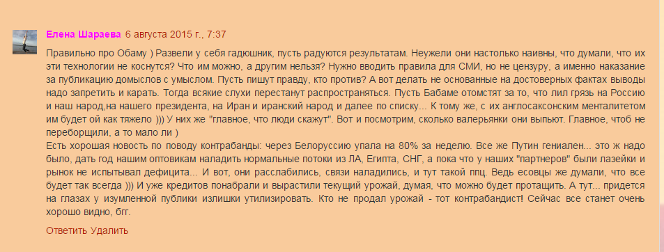 Вставлю сюда скриник с коммента, я забыл написать что контрабанда упала и фсе такое Согласен что наш Путин гений и мы все делаем правильно, отсюда и визг поросячий