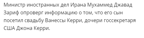 Ну, чтоб было ясно какие масштабы приняло вселенское неполживое вранье и , не побоюсь этого слова, ТРАВЛЯ в СМИ - МИД Ирана вынужден был распространить официальное опровержение этому бреду. Сказали, мол, никакой сын Зарифа ни на какой свадьбе не был и быть не мог, мол, перс тот вообче американец и к нам отношения не имеет, и вообче, мол, первыми сию новасть сообщили израильские СМИ в США, поэтому тут все ясно, ОДНАКО ну хто ж читаит заявления МИД Ирана и потом ну даже если какой то упоротый американец и прочитает, ну кто ж поверит этим исчадиям ада ? Ну праильна? вот и я говорю. Вы читали Зарифа? Праильна, не читали. Вот и амеры не читали