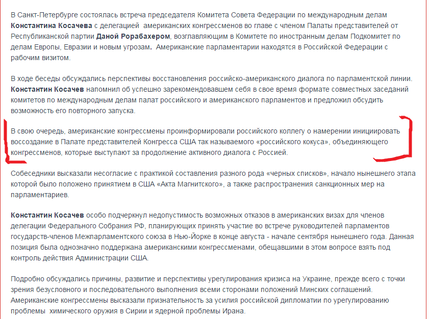 Короче наши партнеры потихоньку идут против течения , то бишь против лобби войны и сформировать что то вроде про-российского лобби в Конгрессе, им будет тяжело, но ясно, что определенная часть американской элиты решила спасать США и глобальную адекватную политику, сие прекрасно.