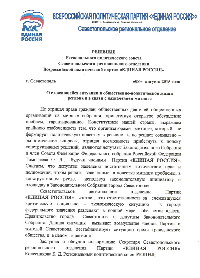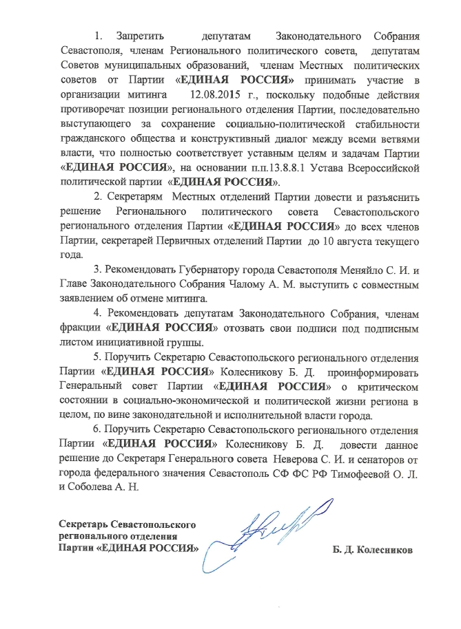 При этом основной рупор организаторов митинга, портал "Форпост", был обвиненhttp://sevastopol.su/news.php?id=78287 членом контрольно-ревизионной комиссии ЕР в том, что он сознательно искажают общественное мнение и грубо говоря "заигрались ребята". Местная партия власти на это посмотрела и посмотрела, да и фактически запретилаhttp://sevastopol.su/news.php?id=78285 своим депутатам в нем участвовать, чтобы не дискредитировать правящую партию (а надо понимать, часть заявителей митинга представляют правящую партию и по факту это конфликт внутри правящей партии) и не расшатывать ситуацию в Севастополе своими руками.