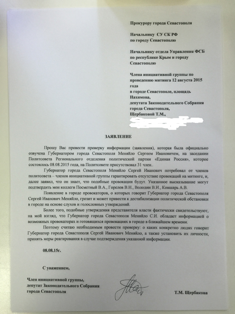 И плюс ко всему недавно в Крым еще Патрушев заезжалhttp://cassad.net/russia/vnutrennyaya-politika/15871-patrushev-zayavil-o-terroristicheskoy-ugroze-v-krymu.html и долго втирал местным силовикам на тему необходимости повысить бдительность перед лицом возможных провокаций. Из законодательного собрания пришла бумага с просьбой прокуратуре проверить факты связанные с возможными провокациями связанными с митингом. Примечательно, что в открыто публикуемом документе одна из фамилий почему-то затерта. Уж не Комелов ли был его соавтором?
