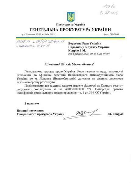 Уголовное производство против главы антикоррупционного бюро открыли после обращения Куприя в ГПУ. По словам последнего, еще 29 июля Сытник включил свою жену Анну Сытник и "таинственную" советницу Ирину Данько в состав официальной делегации для поездки в Великобританию.
