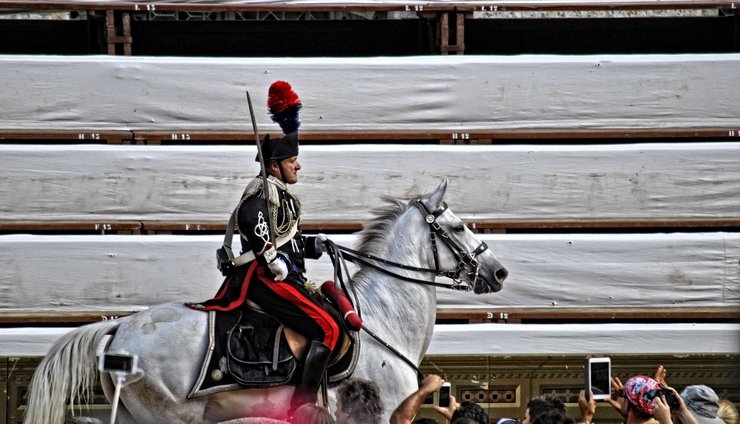 на самом деле вчера я имела удовольствие посетить палио (гонки на лошадях) в городе Сиена. Два раза в год, 2 июля и 16 августа в Сиене проходят эти гонки... сказать, что это главное событие года - значит не сказать ничего.. В разных источниках указываются разные даты начала этой традиции , с большой уверенностью можно сказать, что с 15 в. палио стало событием огромной важности в жизни города... Вкратце - город поден на контрады (раёны))), которые враждуют между собой, иногда тихо , иногда громко)). Каждая контрада (сейчас их 17, раньше было вроде 22) имеет свое название (орел, башня, утка, улитка и т.д), цвета, герб, флаг, гимн. В палео принимают участие одновременно 10 контрад, выбираются по жребию.. Контрада "покупает" жокея (фантино), по жребию определяется так же какой жокей скачет на какой лошади.